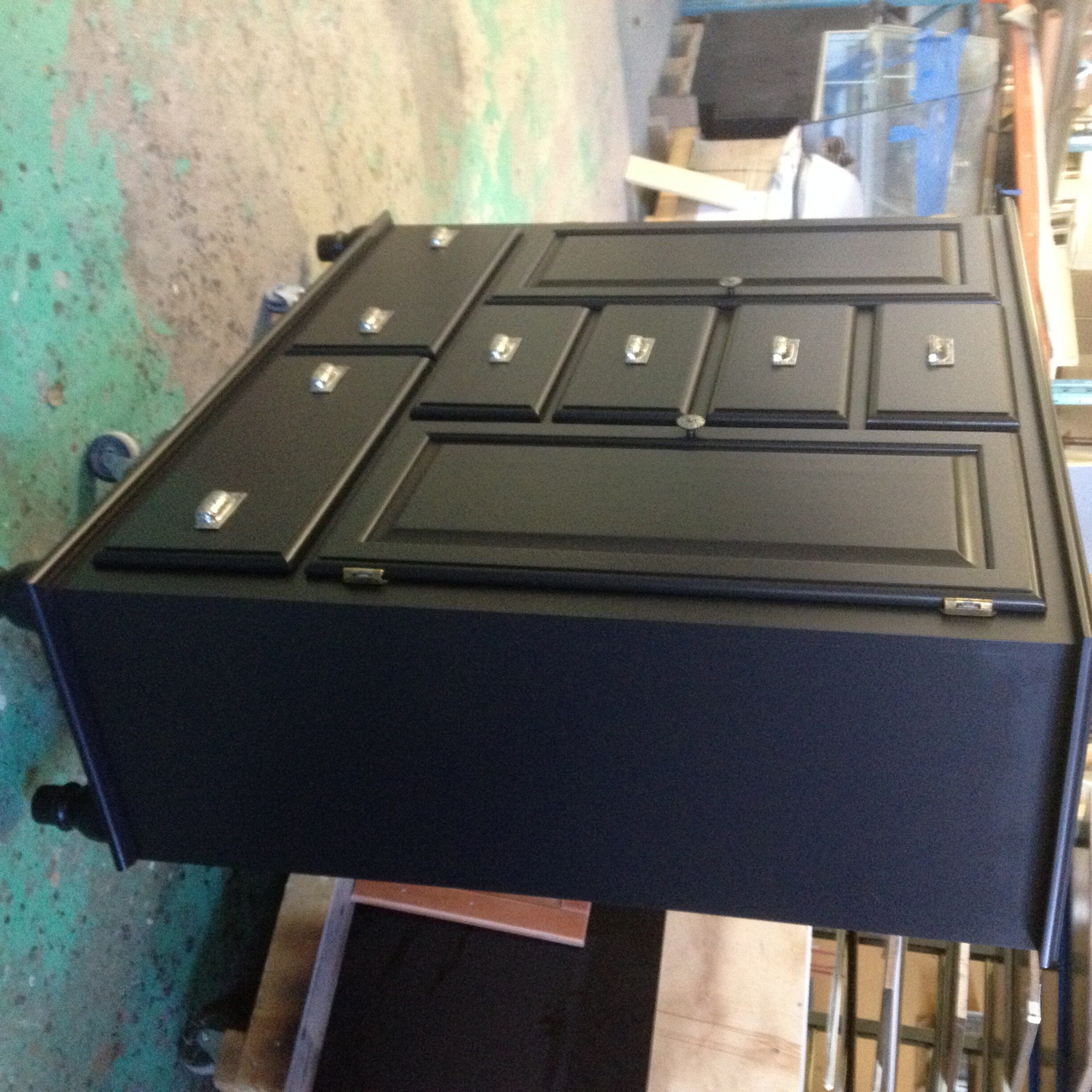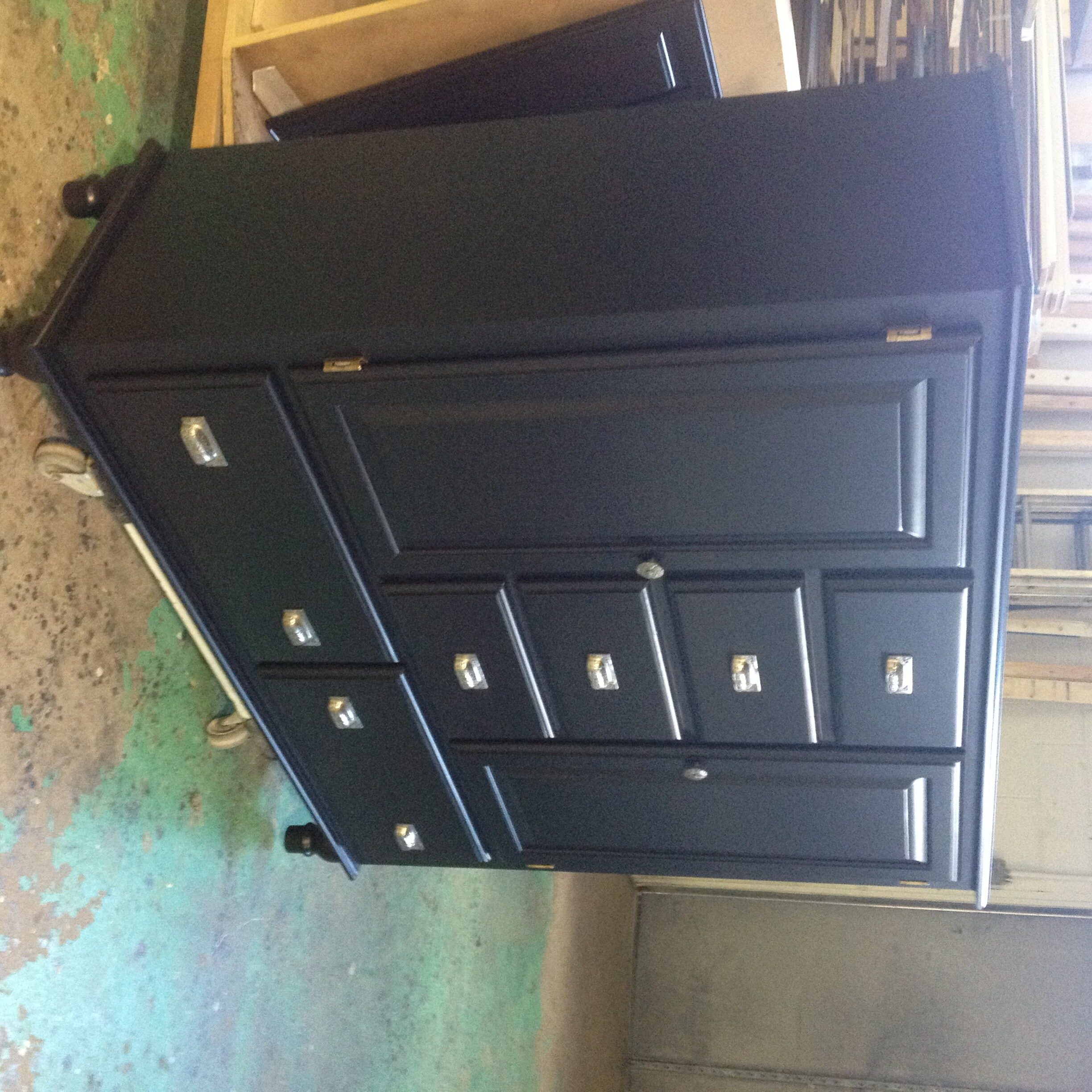 Spray Painted Furniture using Kem Aqua By Sherwin Williams – the colour is Ben Moore Black magic!